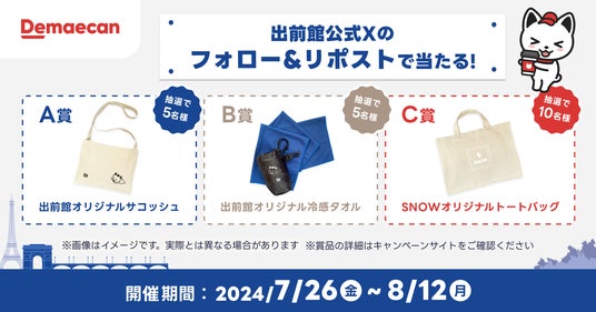 キャンペーン期間中に出前館公式X(https://x.com/demaecan)をフォロー&キャンペーン投稿をリポストしていただいた方の中から抽選で20名さまに、オリジナルグッズをプレゼントいたします。