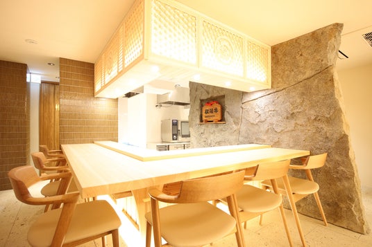 大谷石が敷き詰められた床と組子照明、そして高級感溢れる檜のカウンターが目を引く肉割烹。お食事は五感で味わう至高のおまかせコース一本のみ。旬の食材を織り混ぜ、和牛の旨味を最大限に引き出した極上の逸品をご提供します。大切な方との特別なひとときをお楽しみ下さい。