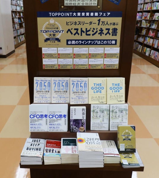 本賞の決定に伴い、丸善ジュンク堂書店・文教堂・未来屋書店の主要大型店約50店舗にて「TOPPOINT大賞受賞書籍フェア」を開催します。フェアでは、ベスト10冊に選ばれた各書籍を、その書籍の読みどころや読者のコメントを記したPOPと並べて展開。また、本賞の概要を紹介した小冊子(無料)も配布します。