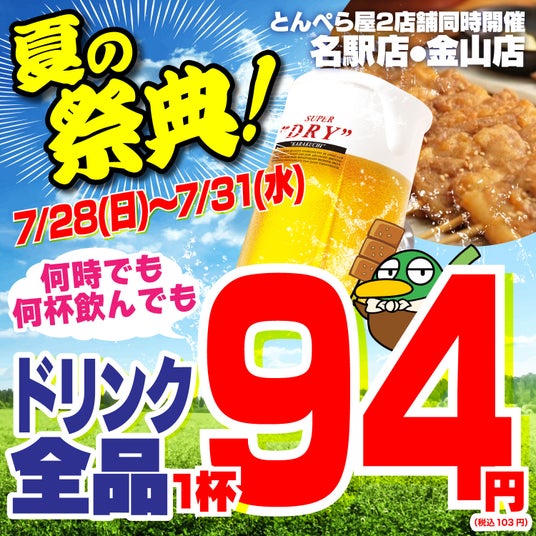 フラッグシップブランド「新時代」等を全国200店舗展開する株式会社ファッズ(本社:愛知県名古屋市、代表取締役:佐野直史)は、鴨と豚『とんぺら屋』にて、夏の祭典を開催します。2024年7月28日(日)~31日(水)、ご来店者全員、何時でも、何杯飲んでも、1杯94円(税込103円)。もちろん、生ビールも対象で、アサヒ新スーパードライ。