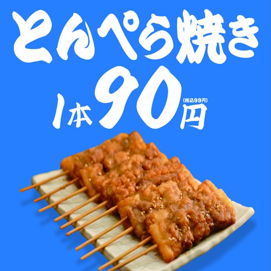 『とんぺら屋』の名物商品は、注文率100%超えの、1本90円の『とんぺら焼き』です。『新時代』の名物商品『伝串』と同じ味付け、高麗人参を贅沢に配合した独自のタレと、主成分が大豆の独自スパイスを使用。串の原材料は、豚ばら肉を使用し、ジューシーさを味わえます。とんぺら焼きの開発者は、伝串と同じ、元ブラジルのプロサッカー選手『佐野直史』です。『世界の食料価格高騰阻止』というスローガンのもと、本物の食材を生活価格でお楽しみ頂ける事を実現させております。各社が値上げにふみきるなか、新時代同様に、とんぺら屋も、値上げする事なく、とんぺら焼き90円・生ビール1杯190円を続けております。