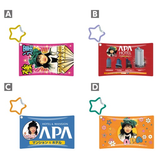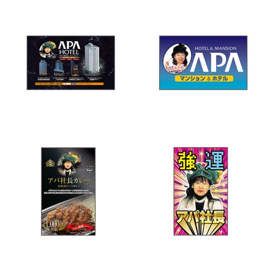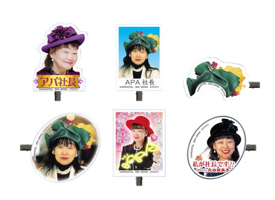 おまもり替わりに使用してカバンなどに付けて持ち歩けば良いことが起きそうな『アパ社長 おまもり型アクリルプレートキーホルダー』をはじめ、普段のお化粧時に前髪クリップとして使用をしたり、旅行の際にも便利な『アパ社長 クリップこれくしょん』、おなじみの看板デザインや、アパ社長カレーデザインなど、社長が大きくデザインされた約82cm×約50cmの大判タオル『アパ社長 ビッグサイズビジュアルタオル』、さらに、「ハンサム!」や「ピンチをチャンスに!」など社長のポジティブな応援メッセージ入りのキラキラ光るホログラム加工した『アパ社長 ポジティブ応援ホログラム缶バッジ』、コインケースや今話題の「ガチャ詰めポーチ」にも使える星型のカラビナが付いた『アパ社長 星型カラビナ付きクリアポーチ』などがラインアップ。