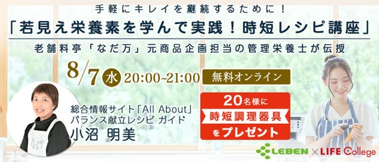 株式会社オールアバウト(本社:東京都渋谷区、代表取締役社長:江幡 哲也、以下「オールアバウト」)は、総合情報サイト「All About」 バランス献立レシピ ガイドで管理栄養士の資格を持つ小沼 明美さんを迎え、無料ウェビナー「LIFE College『若見え栄養素を学んで実践!時短レシピ講座』」を2024年8月7日(水)20時から配信します。また、同時にLIFE College初となるレシピコンテストを開催します。