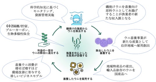 ウニノミクスは国内外の複数拠点で増えすぎたウニを採集し、天然由来の飼料を与えて食用に適したウニへと畜養を行います。畜養されたウニは食用として販売され、販売利益はさらなる事業拡大を通じてウニの除去や藻場の回復に還元されます。