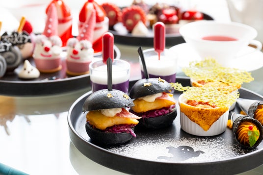 セイボリープレートは、ビーツピューレがアクセントの「紫芋のポタージュ」や「フィッシュバーガー」など、おばけたちの怪しげな食事会をイメージしました。