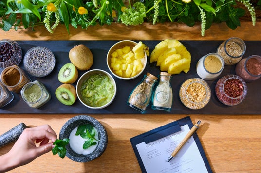 まずはフレッシュハーブが植えられたブレンドバーでお出迎え。摘み立てハーブや季節のフルーツ、美肌に効果的なヨーグルトやチョコレートが並ぶ3段のスタンドから選んだ素材を石臼で圧搾し、自分だけのスクラブやマスクをセラピストが目の前で調合してくれるクリエイティブな体験をお楽しみいただけます。
