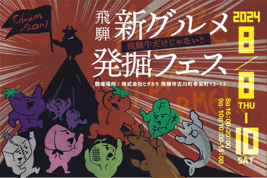 株式会社ヒダカラ(岐阜県飛騨市、以下当社)は、8月8日(木)~8月10日(土)に「おいしさはじける!たのしさはじける!夏のヒダカラマルシェ」の企画の一貫として、「飛騨牛だけじゃない!飛騨・新グルメ発掘フェス」を開催いたします。