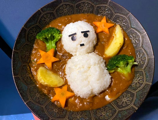 1作目『大室家 dear sisters』で登場した花子の甘口の手作りカレーと、2作目『大室家 dear friends』のラストに登場した大室家雪だるまを模したご飯。雪だるまご飯は、三人のうちどの表情になるかはランダムです。(写真は撫子)