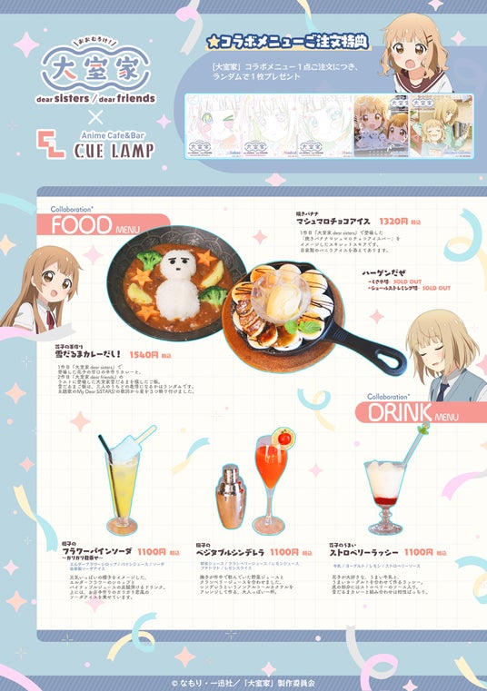 CUE LAMP風にアレンジした映画『大室家 dear sisters/dear friends』に登場したフード2種、大室家の三姉妹をイメージしたカクテル3種を提供いたします。