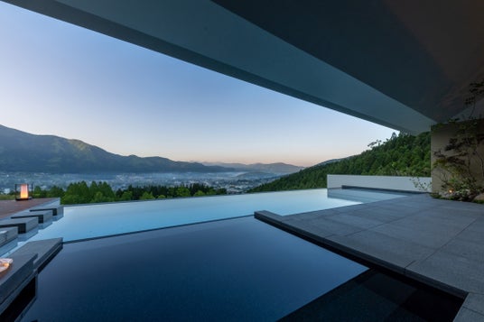 中でも、本施設のメインとなるヴィラ棟は、客室に大開口の窓を設け由布岳や湯布の街を一望できるテラスを設けることで外部空間との一体化を図りつつ、敷地内の豊富な高温温泉水を利用し、自然冷温装置である湯雨竹(ゆめたけ)で適温に調整した100%かけ流しの天然温泉の露天風呂と温水プールを設けることで圧倒的な自然空間を取り入れた優雅な空間を実現しました。