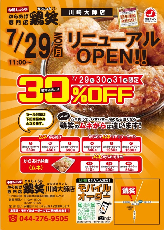 からあげ専門店「鶏笑 川崎大師店」2024年7月29日(月)リニューアルオープン!