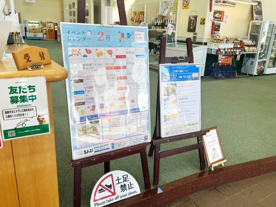 大イーゼル設置で告知を強化!こちらの施設では、受付横にA1サイズに印刷したイベントカレンダーをイーゼル設置。毎月のイベント内容や告知欄に記載した3つの紹介情報を効果的に告知しています。