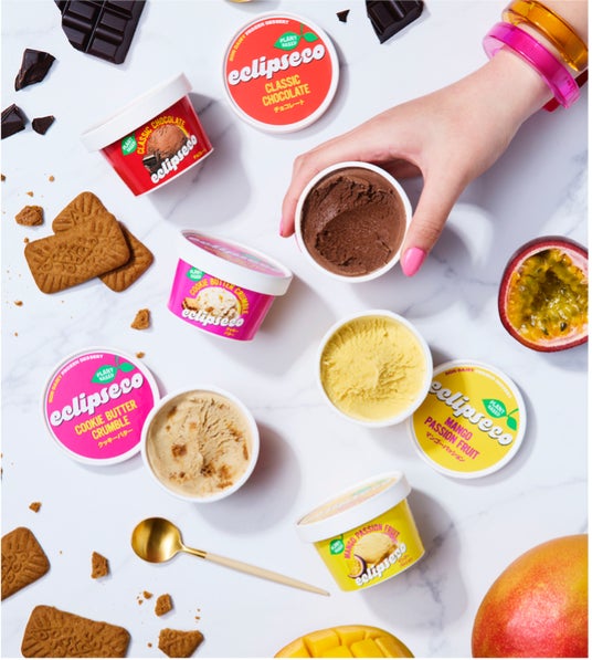 日本では、米国でも特に人気の高いフレーバー3種類「eclipseco チョコレート」「eclipseco クッキーバター」「eclipseco マンゴーパッション」を展開しています。「eclipseco チョコレート」はショコラティエが作る濃厚なチョコレートを、クリーミーなアイスに混ぜ込みました。コクのあるチョコレート味のとりこになること間違いなしのフレーバーです。「eclipseco クッキーバター」は、クッキーのような味わいでシナモンやジンジャーの香りが口いっぱいに広がります。食べ応え満点でアメリカでも人気NO.1のエクリプスコの代表作です。そして、「eclipseco マンゴーパッション」はジューシーなマンゴーと酸味の効いたパッションフルーツの2つの味がクリーミーなアイスと溶け合う、夏にぴったりのトロピカルフレーバーです。