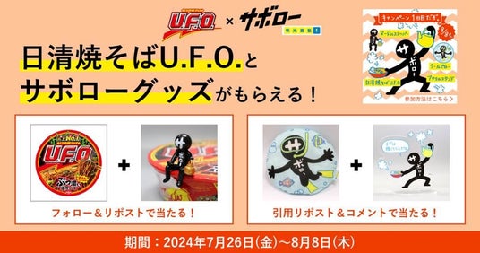 期間中、サボロー公式Xアカウントをフォロー&キャンペーン投稿をリポストしていただくと、200名さまに日清焼そばU.F.O.1ケース(12食入り)&サボローヌードルストッパーがその場で当たります。さらに、#サボローとUFOの夏&コメントをつけて引用リポストで、20名さまにサボローのクールピロー&アクリルスタンドが当たるWチャンス!たくさんの“濃い”コメントをお待ちしています!