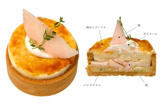 バニラ香るなめらかなフランにジューシーな白桃を敷き詰め、桃風味のシブーストを乗せて香ばしくキャラメリゼしました。