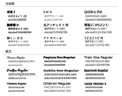 新しくデザインシミュレーターに追加された書体は、モリサワの日本語書体が20種類、グーグルフォントの英語書体が11種類です。今まで搭載していた28種類の書体と合わせて、全59種類の書体が使用可能になりました。※画像は、新書体の一部を表示しています。