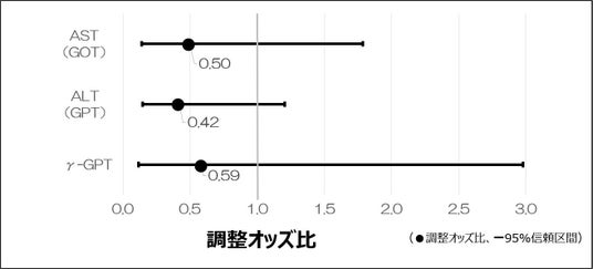 中性脂肪値(図2)と肝機能指標(AST、ALT、γ―GTP)(図3)について、レモン非介入群を1とした際にレモン介入群では非介入群と比べて有意ではありませんが、オッズ比が1.0以下の低値を示しました。