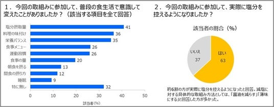 参加者の特徴として、成人の全国平均摂取量と比較しカルシウム、ビタミンCの摂取量が多い傾向となっており、一方で食物繊維の摂取量が少なく、食塩の摂取量が多い傾向でした。5年後(2023年)には、食塩摂取量が減少する傾向が見られ、図6のアンケート回答が示すとおり参加者のうち41%が普段の生活で塩分摂取量を意識するようになり、実際に参加者のうち63%が塩分を控えたと回答し健康に配慮した行動に繋がったことを確認しました。