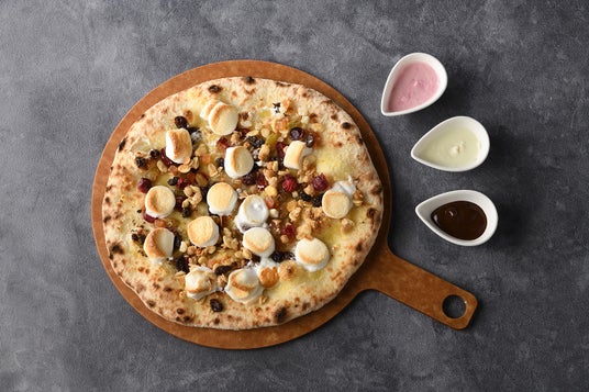 パフォーマンスで使用される“マシュマロ”と“グラノーラ”を使用したスイーツピザ。マシュマロの甘さにグラノーラとナッツの香ばしさや食感、ドライフルーツのほど良い酸味をかけあわせた味わいです。