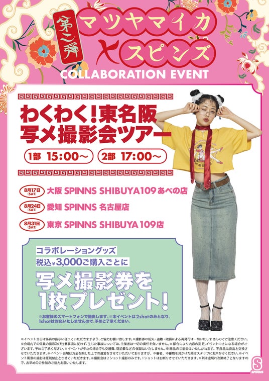 ・全日イベント参加条件:イベント当日、イベント開催店舗にてマツヤマイカ×SPINNSコラボレーション商品税込3,000円毎お買い上げで1枚写メ撮影券を1枚お渡しいたします。