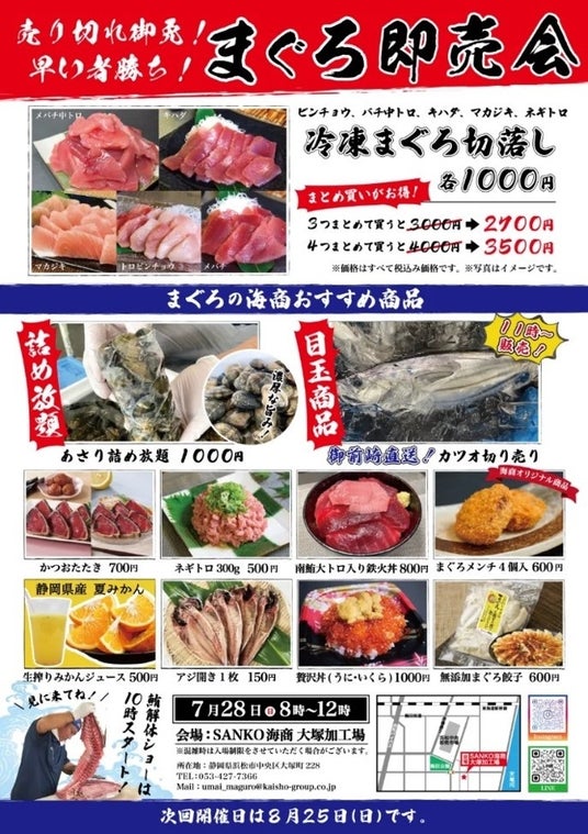 2024年7月の即売会では、恒例の各種冷凍まぐろ切り落とし各種、人気の「詰め放題」企画に仕入れ担当者が厳選したアサリをご用意し、大満足の「アサリの詰め放題」が登場いたします。また、名物の「まぐろメンチ」のほかに、「本まぐろ中トロ寿司」、ウニやイクラがたっぷりとのった「贅沢丼」など新たな商品もラインナップ。今開催では、小学生以下のお子様を対象にした「お菓子の詰め放題」企画も予定しており、店頭はお買い得品ばかりとなりますので、この機会をぜひお見逃しなくお楽しみいただけることを期待しております。