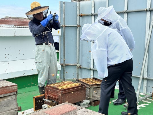 養蜂家に指導を受けながらスタッフが巣箱の手入れやミツバチの飼育を行う