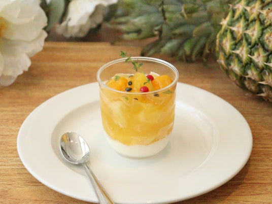 台湾パインのコンポートとジュレをココナッツパンナコッタに重ね、アクセントにパッションソースと沖縄マンゴーを乗せました。タイムとミントが香ります。