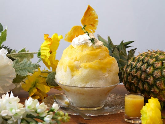 さわやかな台湾パインソースと濃厚なココナッツミルクを合わせました。ナタデココとパインのコンポートが入った、夏にピッタリなかき氷。
