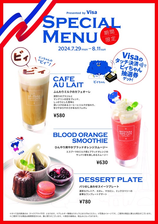 期間中はVisaの公式マスコット「ビィちゃん」とのコラボメニューとして、ドリンク2品・デザートプレート1品をご用意しています。