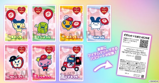 また、「たまごっちコラボ【Hut Melts ぴんくプラス】ふわたまベーコン」をご購入いただいた方には、「ピザハット×たまごっち」コラボを記念し、ピザハットの店員に変身したたまごっちのキャラが描かれた「オリジナルシール」をランダムで1枚プレゼントいたします。そして、シール裏面のパスワードを「Tamagotchi Connection」で入力するとTamagotchi Connection内で使える「ピザ」アイテムもゲットすることができます。