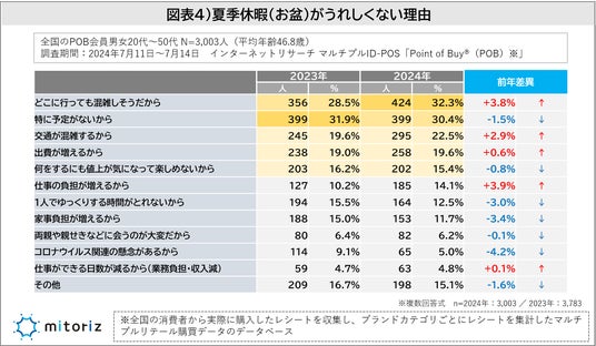 夏季休暇(お盆)がうれしくないと回答した人を対象に理由を尋ねたところ「どこに行っても混雑しそうだから(32.3%)」が最多となり、2023年より3.8%増という結果となりました。「交通が混雑するから(22.5%)」も同様に2.9%増となっており、個別のコメントでも「インバウンド増加でどこも混みそうなので外出は控える」といった趣旨のものが多数あげられていました(図表4)。