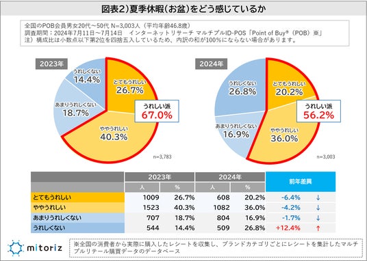 ・夏季休暇を“うれしい”と感じている人は56.2%で2023年の67.0%から10%のマイナス