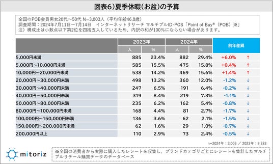 「夏季休暇(お盆)の予算」を調査したところ、最も多い回答は「5,000円未満(29.6%)」となり、2023年よりも6.0%増となりました。2023年と比較して20,000円未満が増加している一方で、20,000円以上は軒並み減少しており、物価高の影響もあってか、2024年の連休に向けた予算は縮小傾向にあるようです(図表6)。