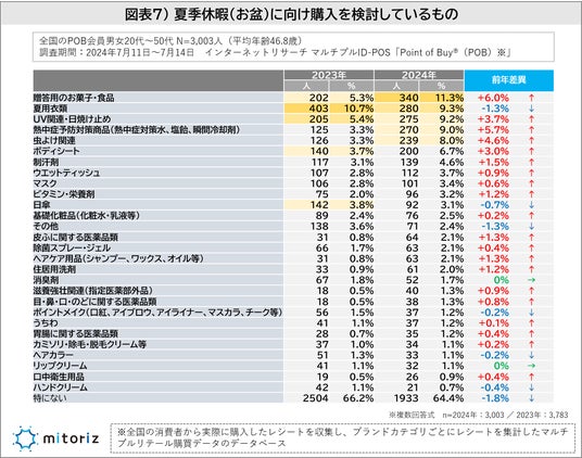 「夏季休暇(お盆)に向けて購入を検討しているもの」を調査したところ「贈答用のお菓子・食品(11.3%)」が最多で、2023年から6.0%増加しています。UV関連・日焼け止め、熱中症予防対策商品、虫よけ関連などが昨年から3~6%増加しているのをはじめ、全体的に上昇している傾向がみられます(図表7)。