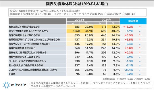 夏季休暇(お盆)がうれしいと回答した人に理由を尋ねたところ「家族と過ごす時間が増えるから(42.2%)」が最多で、2023年より15.2%増となりました。「ゆっくりと身体を休めることができるから」も40.2%と多く回答されていますが、やや減少しています。新型コロナ関連の制限緩和も21.4%と大幅に減少しており、新型コロナの影響を懸念している人が減っている様子がわかります(図表3)。