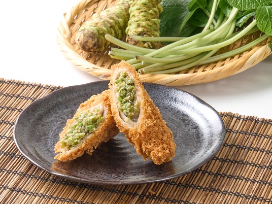 まい泉で人気の「巻きかつ」に、旬のわさびを組み合わせた新商品が登場します。安曇野産の「茎わさび」を塩だれで和え、大葉と一緒に豚肉で巻いた一品です。調理工程でわさびの辛味を抑え、風味を引き立てる工夫をしています。わさびと大葉の香りが爽やかな、夏にこそ楽しみたい揚げ物です。そのままでも、醤油をつけて召し上がっても美味しくお召し上がりいただけます。