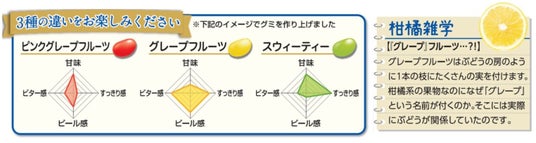 柑橘の濃厚で繊細な個性の食べ比べを楽しめるつぶグミです。春日井製菓独自の「果汁W仕込み製法」により、果汁のコクとフレッシュさを感じられる味わいに仕上げました。ピンクグレープフルーツ味、グレープフルーツ味、スウィーティー味 のアソート。