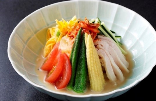 のど越しの良い極細麺を使用した冷麺です。かけダレは「柑橘の香り漂う醤油ベース」または「リンゴ酢使用・濃厚胡麻ベース」の2種類から選べます。