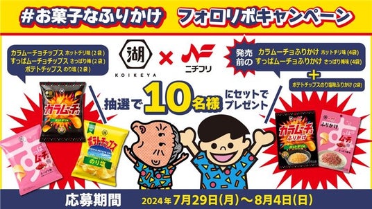 「カラムーチョホットチリ味ふりかけ」「すっぱムーチョさっぱり梅味ふりかけ」と湖池屋のスナックの詰合せが当たるキャンペーンを実施します。新商品のふりかけが発売前に手に入るチャンス!