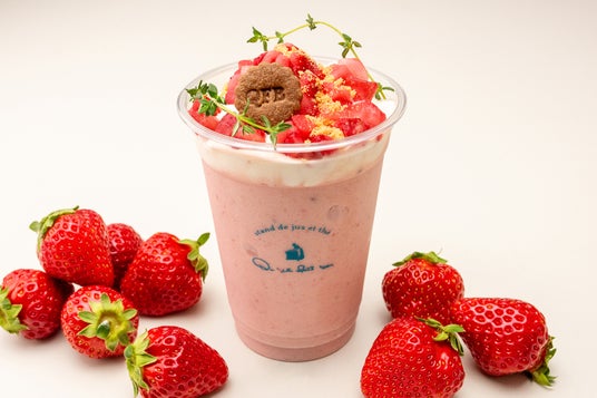 国産紅茶にハイビスカスやカカオの殻を合わせたブレンドティーと、甘く濃厚なイチゴを組み合わせたフルーツティー。つぶつぶとしたイチゴ果肉の食感と、コクがありながらスッキリとした味わいをお楽しみいただけます。