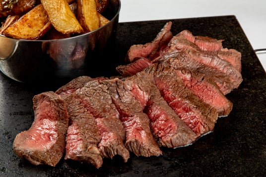 ●ステックフリット300°のオーブンで熱した天然石の上にブルーレアの状態のステーキを載せて提供します。