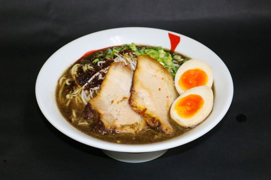 味玉剛麺黒 1100円オリジナル「剛麺」にニンニクとゴマで仕上げた「黒マー油」をトッピング。コクと旨味がさらにアップする本店でも人気のメニューです。