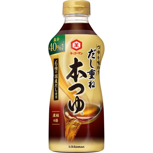 「だし重ね 本つゆ 塩分40%カット」は、塩分を40%カット(*1)した濃縮4倍のつゆです。塩分を40%カットすることで、だし本来のうま味をより引き立たせました。