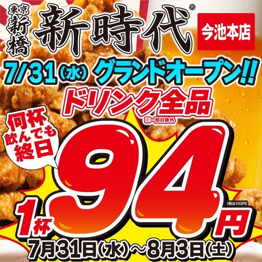 「新時代 今池本店」のオープンを記念し、ドリンク全品94円(税別)キャンペーンを開催します。