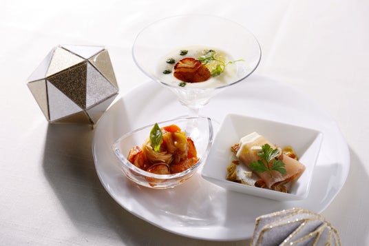 【冷製】・オマール海老と三輪素麺のパスタ風 ・冷製じゃが芋のスープとホタテ貝柱のポワレ