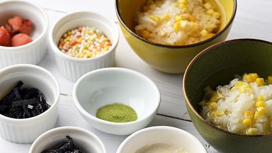焼きもろこしご飯 お茶漬けセットとうもろこしをふんだんに使用したご飯に、お好みのトッピングをお選びいただけます。土山茶をかけてお召しあがりください。