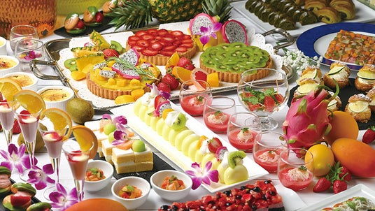 ミックスベリーのケーキ / ライムのシュークリーム / ほうじ茶のテリーヌ / フルーツタルト / 和紅茶のクレームブリュレ / カシスとオレンジのヴェリーヌ / カラフルあんみつ / メロンのショートケーキ / パッションとマンゴーのムース / いちごと土山抹茶のブッセ / マカロン / トリュフショコラ / マンゴーのモンブランココナッツソースとともに / フルーツ
