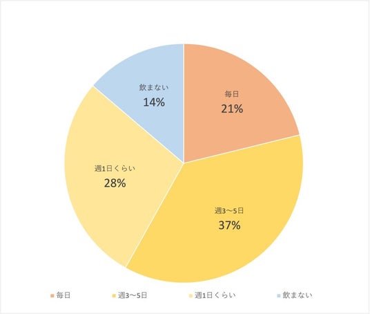 「Q1.週にどれくらい味噌汁を飲みますか?(n=2,134)」と質問をした結果、毎日という回答が21%、週3~5という回答が37%、週1くらいという回答が28%、飲まないという回答が14%だった。