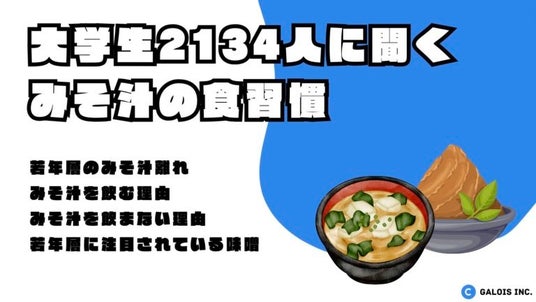 2024年春に、株式会社ガロア (GALOIS Inc.、本社:東京都港区、代表取締役CEO:浅井亮祐、以下当社)は、日本全国の大学生(若者)を対象に「味噌汁を飲む習慣と調理方法」に関する調査を実施いたしましたので、お知らせいたします。