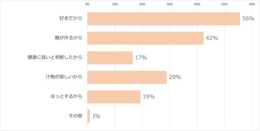 その結果、最も多い回答は「好きだから(56%)」であった。若年層は味噌汁に対して、概ねポジティブな意識を持っているようだ。